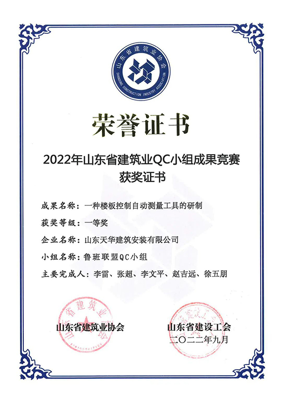 近日,中國建筑業(yè)協(xié)會公布了2022年工程建設質(zhì)量管理小組活動成果大賽獲獎名單,山東省建筑業(yè)協(xié)會公布了2022年度山東省建筑業(yè)QC小組成果競賽獲獎成果名單,天華實業(yè)集團魯班聯(lián)盟QC小組申報的《一種樓板控制自動測量工具的研制》課題,分別榮獲2022年全國工程建設質(zhì)量管理小組活動成果大賽二等獎、2022年度山東省建筑業(yè)QC小組成果競賽一等獎。