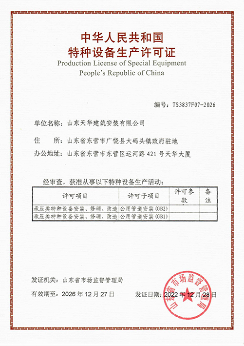 12月28日,從山東省市場監(jiān)督管理局傳來喜訊:天華實業(yè)集團順利通過壓力管道資格認證評審工作,獲得山東省市場監(jiān)督管理局頒發(fā)的中華人民共和國特種設(shè)備生產(chǎn)許可證,獲得公用管道安裝GB1、GB2兩項資質(zhì)。