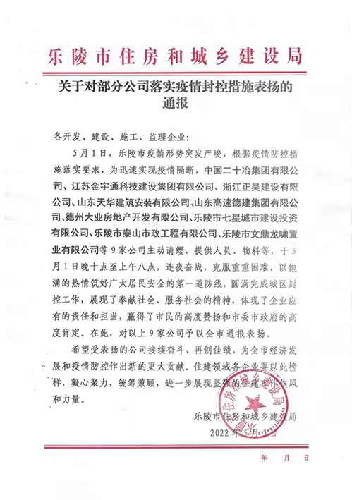 2022年12月28日,天華實(shí)業(yè)集團(tuán)樂(lè)陵碧桂園·湖樾天境項(xiàng)目部收到了來(lái)自樂(lè)陵市碧桂園房地產(chǎn)開(kāi)發(fā)有限公司的表?yè)P(yáng)信。