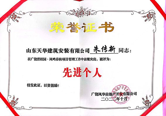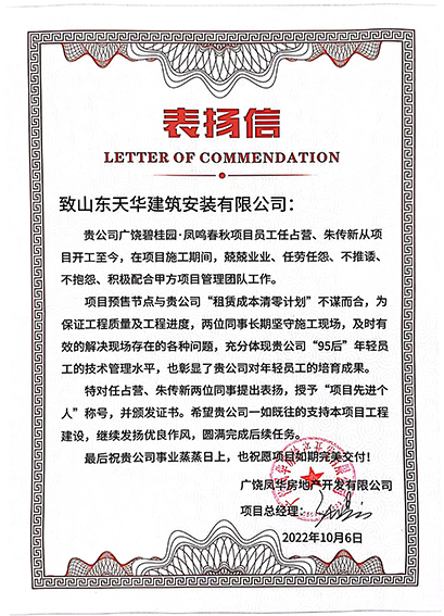 2022年10月6日,天華實(shí)業(yè)集團(tuán)廣饒碧桂園·鳳鳴春秋項(xiàng)目部收到了來(lái)自廣饒鳳華房產(chǎn)開(kāi)發(fā)有限公司的表?yè)P(yáng)信,來(lái)信對(duì)項(xiàng)目部青年員工任占營(yíng)、朱傳新的優(yōu)異表現(xiàn)給予了高度評(píng)價(jià),為他們授予“項(xiàng)目先進(jìn)個(gè)人”稱號(hào),并頒發(fā)證書(shū),鼓勵(lì)青年員工繼續(xù)發(fā)揚(yáng)優(yōu)良作風(fēng),圓滿完成后續(xù)任務(wù)。