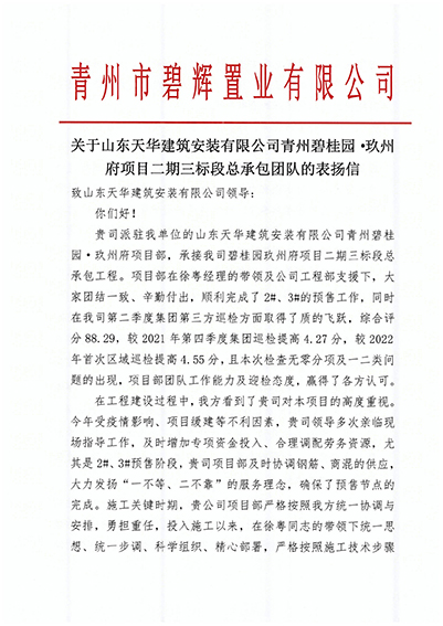 2022年6月10日,青州市碧輝置業(yè)有限公司發(fā)文通報(bào)表?yè)P(yáng)天華實(shí)業(yè)集團(tuán)承建的青州碧桂園玖州府項(xiàng)目,表彰項(xiàng)目部在工程建設(shè)中,落實(shí)工程安全質(zhì)量、搶節(jié)點(diǎn)、迎巡檢等工作中做出的努力和取得的成績(jī)。