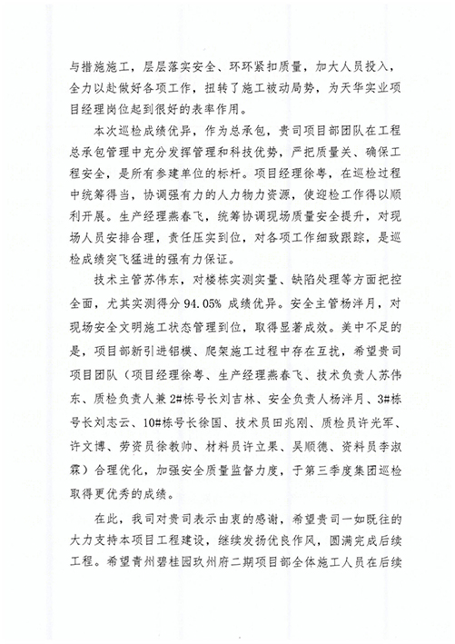 在施工管理中,團(tuán)隊(duì)嚴(yán)保施工節(jié)點(diǎn),狠抓工程質(zhì)量,不論是政府部門(mén)檢查驗(yàn)收,還是碧桂園集團(tuán)巡檢均取得好成績(jī),多次受到集團(tuán)巡檢組及主管部門(mén)的好評(píng),尤其在2022年第三季度與第四季度集團(tuán)巡檢中更是取得了90.05分與90.09分的好成績(jī),該成績(jī)?cè)谏綎|區(qū)域第三季度集團(tuán)巡檢排名全區(qū)域第二名,第四季度集團(tuán)巡檢排名全區(qū)域第一名。特對(duì)本項(xiàng)目全體管理人員辛苦付出提出表?yè)P(yáng)和對(duì)貴公司高質(zhì)量管理水平的認(rèn)可,同時(shí)授予本項(xiàng)目部“優(yōu)秀團(tuán)隊(duì)”稱號(hào)。