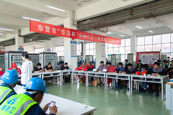 東營市住房和城鄉(xiāng)建設(shè)管理局黨組成員、副局長徐競科,市技師學(xué)院黨委委員、東營市中等專業(yè)學(xué)校黨總支書記趙壽亭,市建設(shè)工程安全與設(shè)備管理協(xié)會會長商雷雷,市住房和城鄉(xiāng)建設(shè)管理局工會負(fù)責(zé)人任鳳,山東華濱建工有限公司總經(jīng)理孟凡國,各縣區(qū)、市屬開發(fā)區(qū),省黃三角農(nóng)高區(qū)住房城鄉(xiāng)建設(shè)局安全監(jiān)督管理機構(gòu)有關(guān)同志,參賽選手以及市技師學(xué)院電力工程專業(yè)的學(xué)生等 60 余人出席大賽。市建設(shè)工程施工安全管理站站長楊海峰主持大賽。