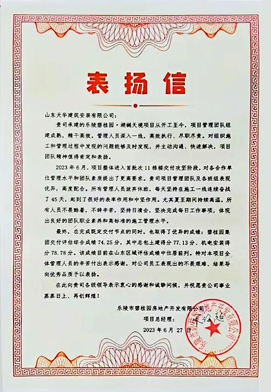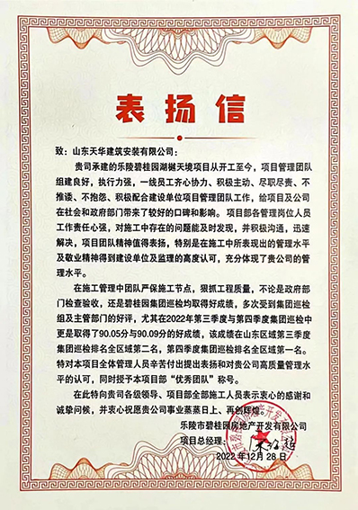 2022年12月28日,天華實業(yè)集團樂陵碧桂園·湖樾天境項目部收到了來自樂陵市碧桂園房地產(chǎn)開發(fā)有限公司的表揚信。