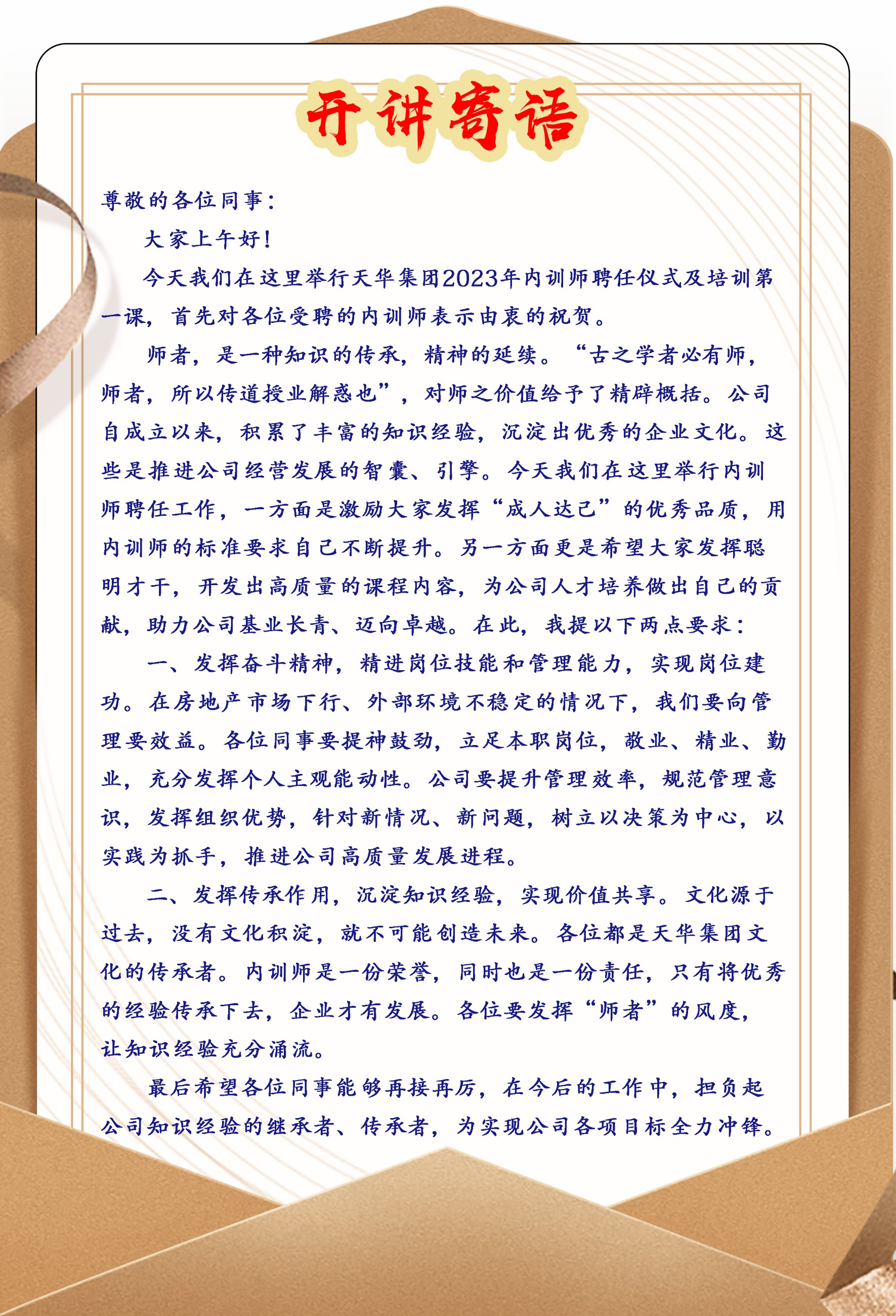 9月4日,天華實(shí)業(yè)集團(tuán)2023年度內(nèi)訓(xùn)師聘任儀式暨培訓(xùn)第一課在集團(tuán)公司舉行。集團(tuán)副總經(jīng)理徐帥菊出席儀式并發(fā)表開(kāi)課寄語(yǔ),集團(tuán)安全總監(jiān)商雷雷、各內(nèi)訓(xùn)師共20余人參加了活動(dòng)。