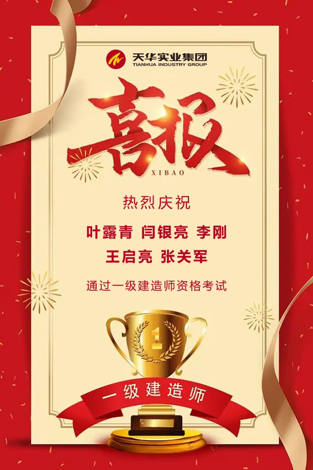 近日,中國人事考試網(wǎng)公布了2023年度全國一級建造師資格考試成績,天華實業(yè)集團工程部葉露青,結算部閆銀亮,財務部李剛,六分公司德州臨邑金辰雲(yún)境項目部王啟亮、碧桂園?天宸項目部張關軍等五名員工順利通過考試,體現(xiàn)了天華員工在工作中積極進取、提升自我,不斷提高崗位技能的專業(yè)精神,也為公司高質(zhì)量發(fā)展再添新動力。