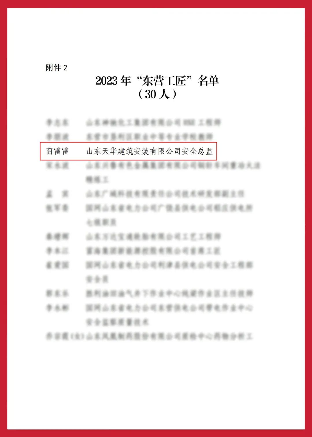 近日,東營(yíng)市總工會(huì)公布了2023年黃河三角洲人才工程“東營(yíng)工匠”名單,經(jīng)過(guò)逐級(jí)推薦、資格審核、網(wǎng)絡(luò)投票、專家評(píng)審等環(huán)節(jié),天華實(shí)業(yè)集團(tuán)安全總監(jiān)商雷雷被授予2023年“東營(yíng)工匠”榮譽(yù)稱號(hào)。此項(xiàng)殊榮的獲得,充分展現(xiàn)了新時(shí)代天華實(shí)業(yè)集團(tuán)員工立足本職、崗位建功、爭(zhēng)做標(biāo)兵的昂揚(yáng)斗志和努力拼搏、奮發(fā)有為的精神面貌。