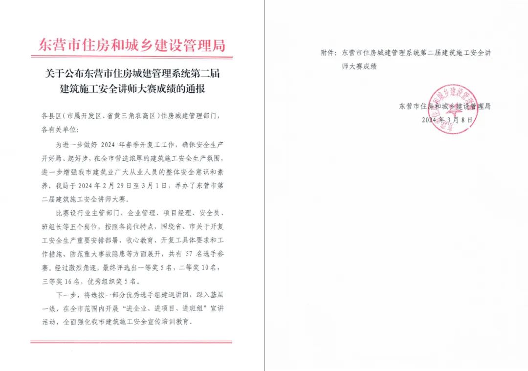本屆大賽由東營(yíng)市住房和城鄉(xiāng)建設(shè)管理局主辦,旨在深入貫徹落實(shí)國(guó)務(wù)院安委辦“十五條硬措施”、省委省政府安全生產(chǎn)“八抓二十條”,切實(shí)推進(jìn)東營(yíng)市建筑施工領(lǐng)域安全生產(chǎn)水平提升。天華實(shí)業(yè)集團(tuán)高度重視并積極組織,精心選拔選手參賽,與57名選手同臺(tái)競(jìng)技,各展風(fēng)采。