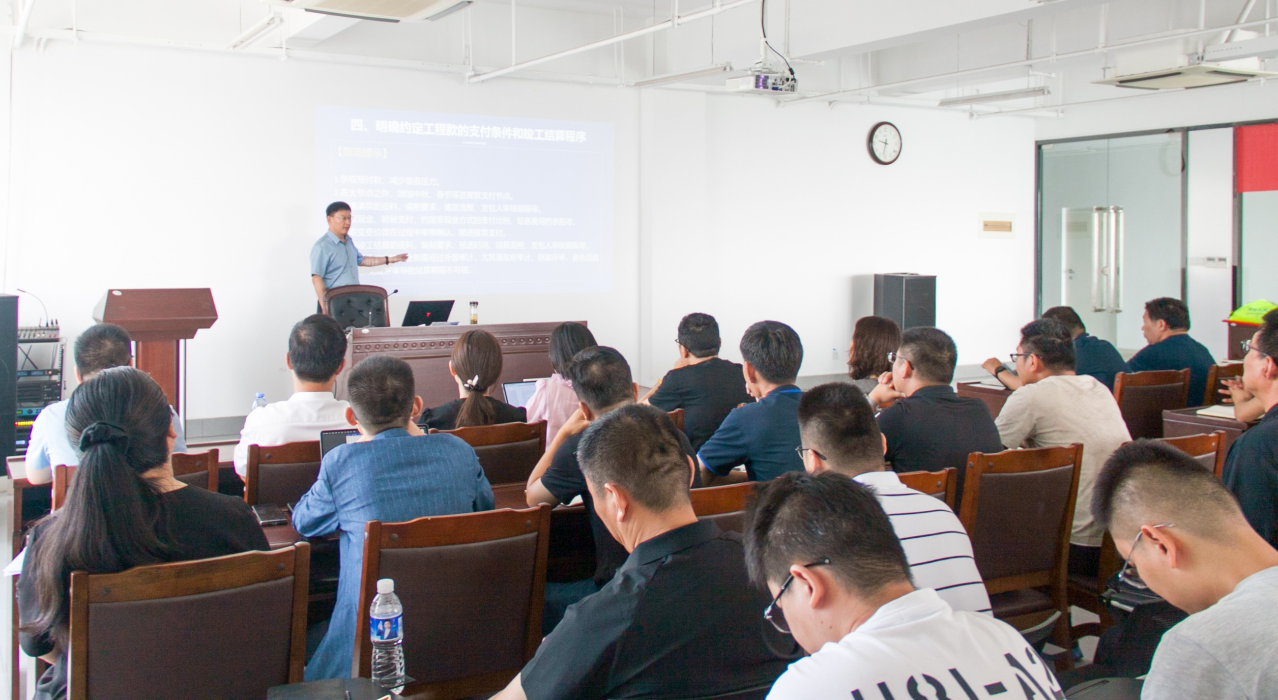 培訓(xùn)會(huì)上,秦律師圍繞建工企業(yè)簽訂施工合同階段法律風(fēng)險(xiǎn)與防范展開(kāi)講解,深入介紹了如何正確使用“背靠背”支付條款、如何做好現(xiàn)場(chǎng)簽證、裁判者視角下的建設(shè)工程施工合同結(jié)算規(guī)則以及企業(yè)在建設(shè)工程合同簽訂和履行中應(yīng)注意的問(wèn)題,期間引入《民法典》等民生相關(guān)法律、法規(guī),對(duì)法律上較為晦澀的名詞及施工過(guò)程中較為常見(jiàn)的法律風(fēng)險(xiǎn)配以案例進(jìn)行說(shuō)明,并就大家在實(shí)際工作中遇到的法律問(wèn)題進(jìn)行解答,提升參訓(xùn)學(xué)員的風(fēng)險(xiǎn)識(shí)別、防范和應(yīng)對(duì)能力。