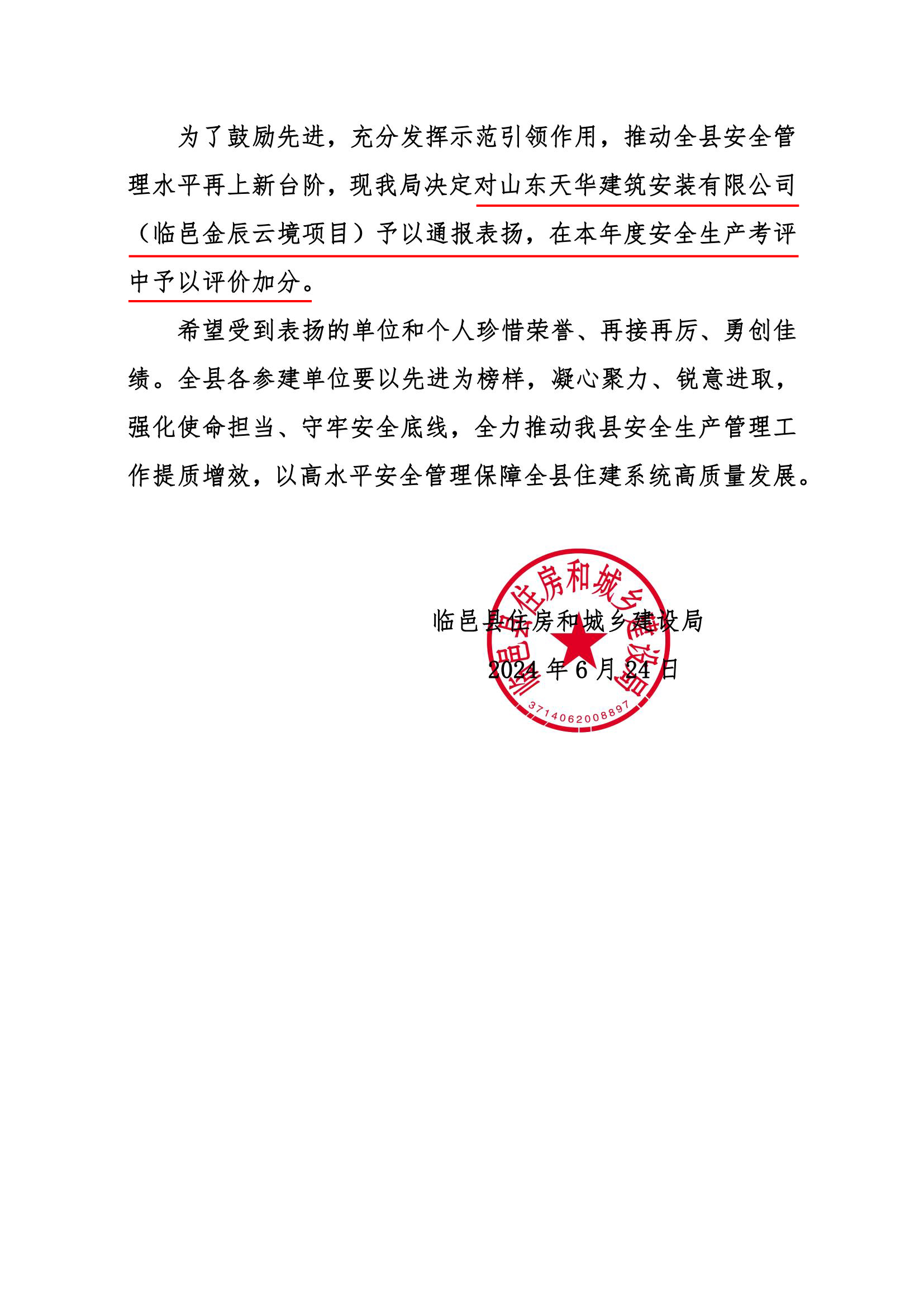 近日,天華實業(yè)集團臨邑金辰雲(yún)境項目部選派徐長潔、劉美全、項田蒙三人,代表臨邑縣參加德州市建筑施工專職安全員知識競賽,并榮獲團體二等獎。臨邑縣住房和城鄉(xiāng)建設局印發(fā)通報,對天華實業(yè)集團金辰雲(yún)境項目部給予表揚,并在本年度安全生產(chǎn)考評中給予加分獎勵。“安全監(jiān)督的責任,就是把各項安全規(guī)章制度、管理措施落到實處。”項田蒙三人覺得,沒有隱患,就是最好的成績。
