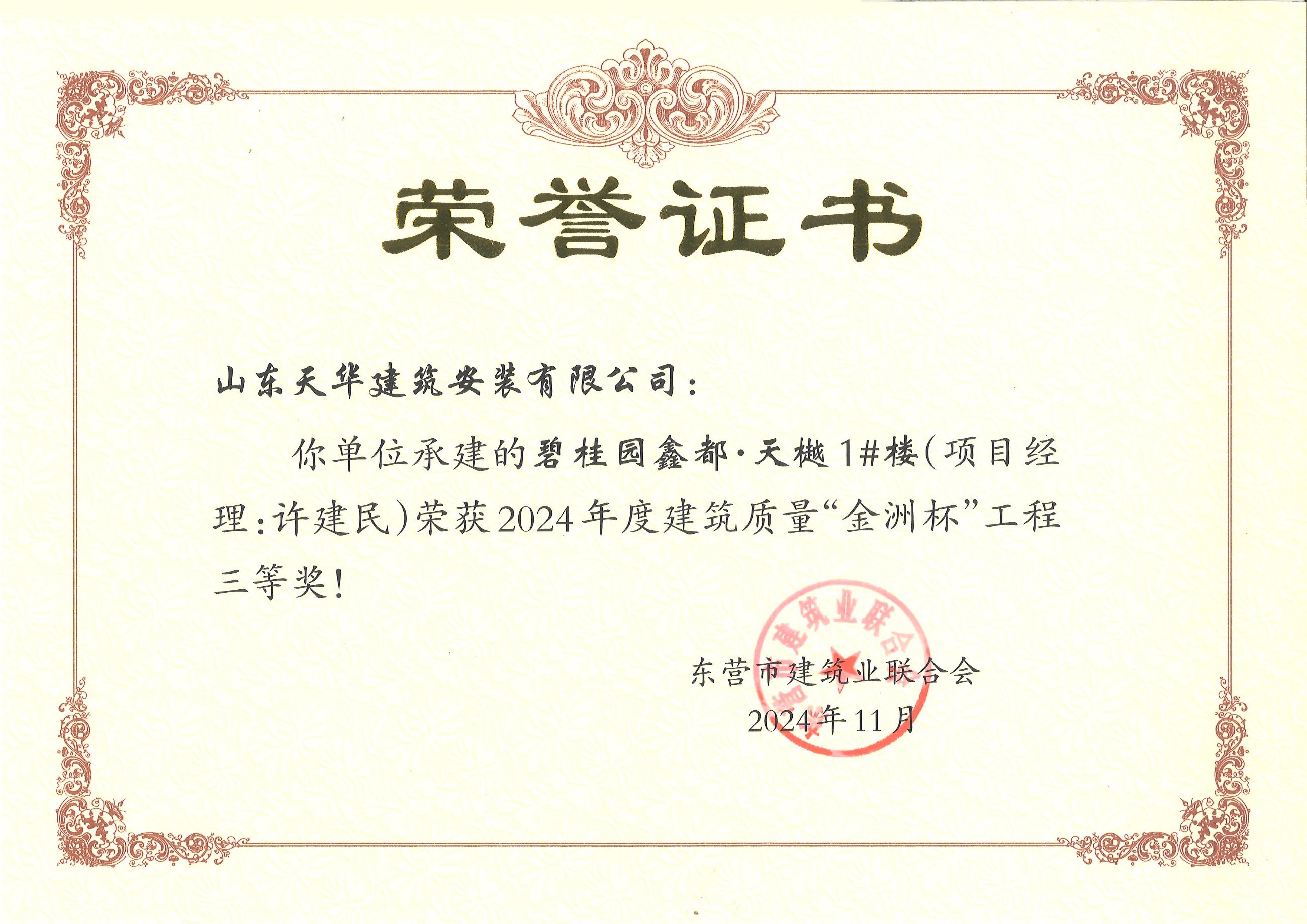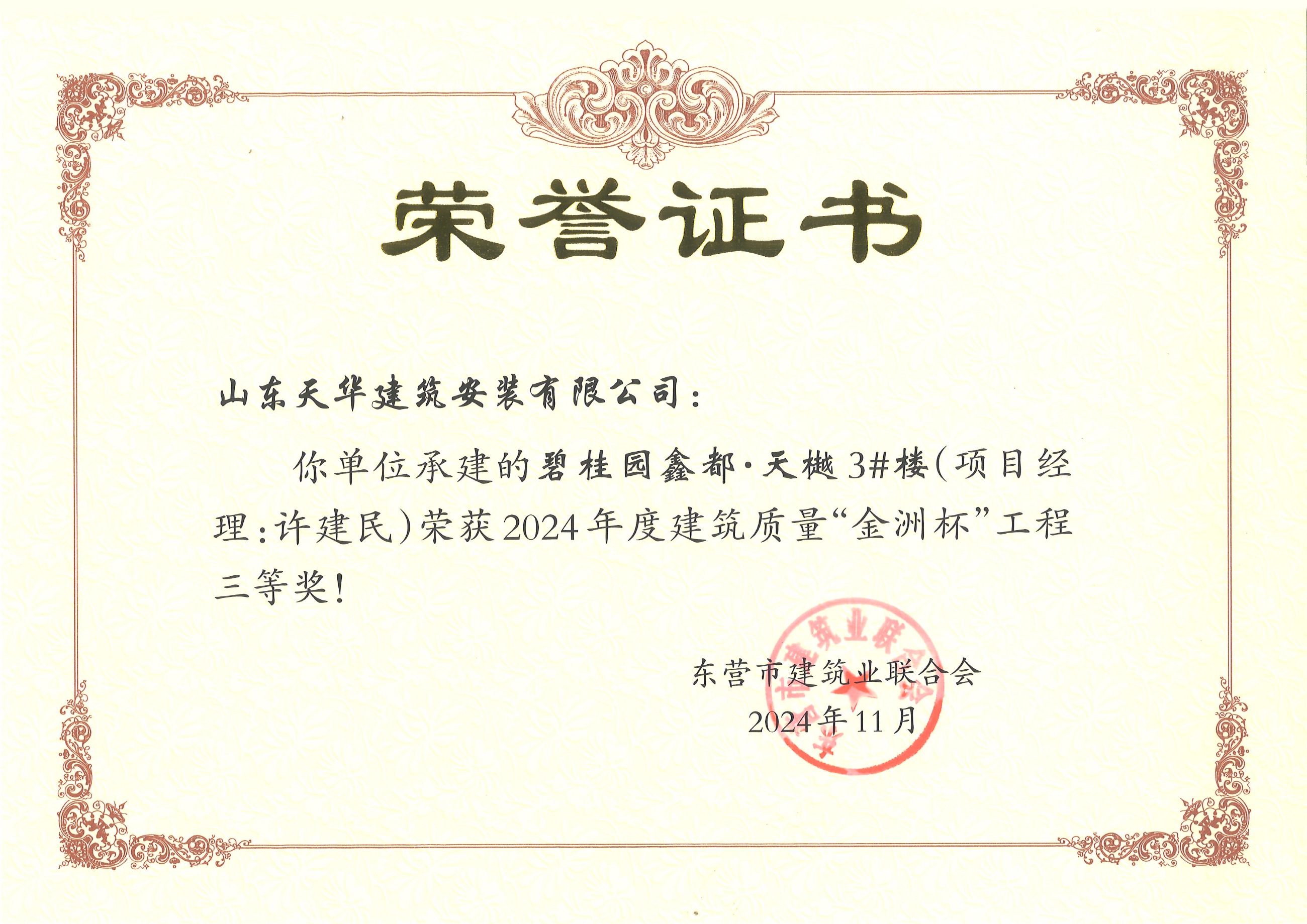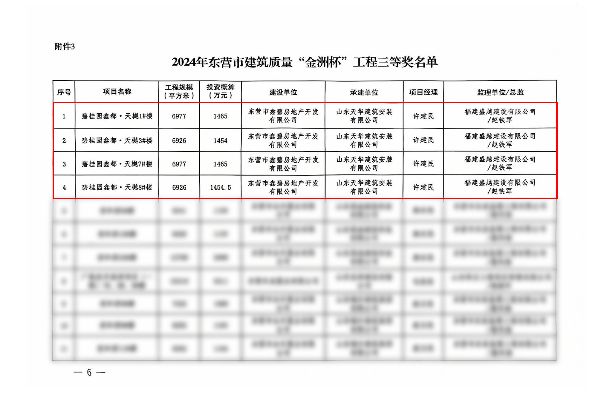 近日,東營市建筑業(yè)聯(lián)合會公布了《關(guān)于2024年度建筑和裝飾裝修質(zhì)量“金洲杯”工程競賽評選結(jié)果的通報》,天華實業(yè)集團承建的碧桂園鑫都·天樾5#樓榮獲“金洲杯”工程競賽一等獎;碧桂園鑫都·天樾1#、3#、7#、8#樓榮獲“金洲杯”工程競賽三等獎。