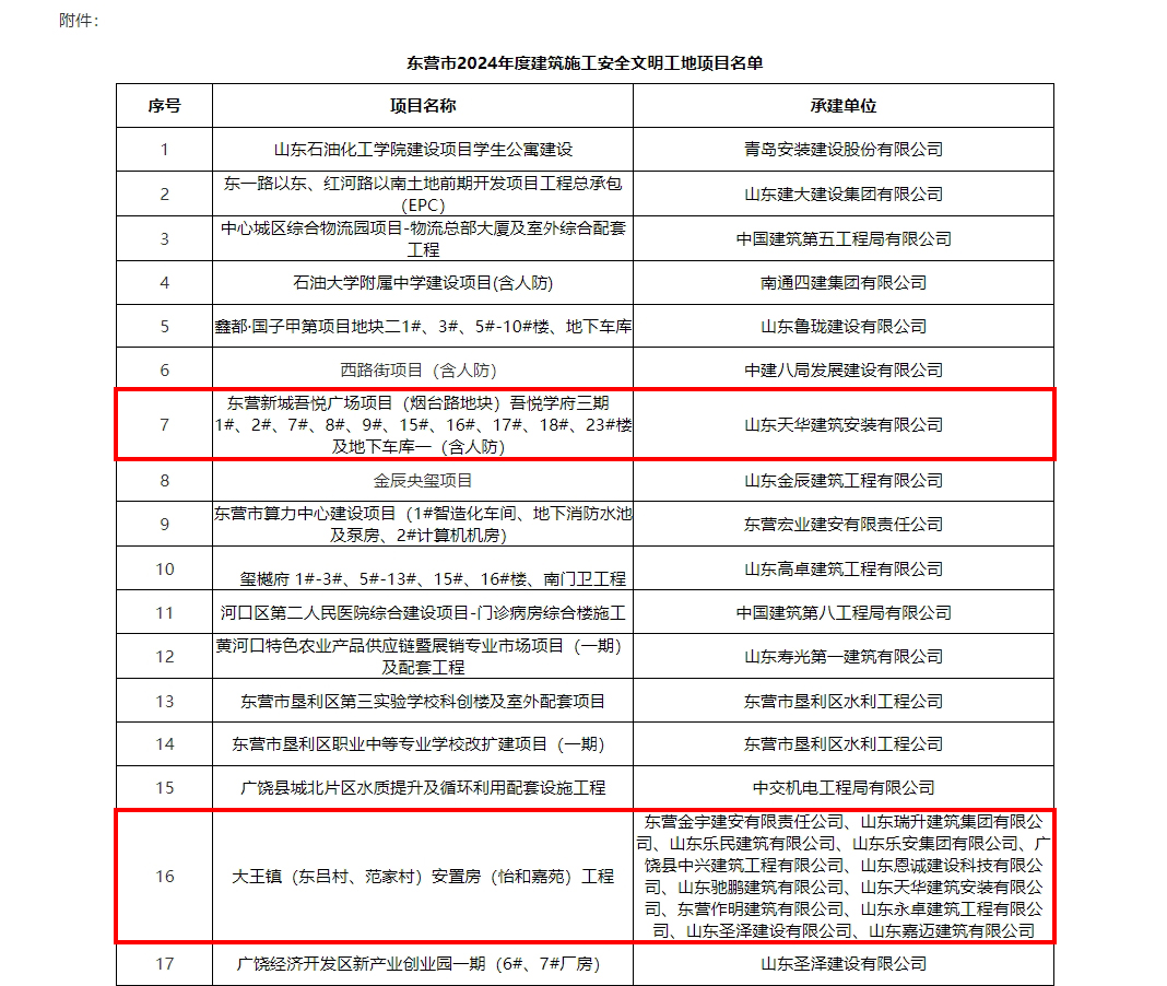 近日,東營市2024年度建筑施工安全文明工地評選結(jié)果揭曉,天華實業(yè)集團承建的東營新城吾悅學府項目、大王怡和嘉苑項目憑借卓越的工程質(zhì)量、施工安全及文明施工表現(xiàn),成功榮獲“安全文明工地”稱號。充分彰顯了企業(yè)品質(zhì)建設(shè)、匠心筑造的實力擔當。