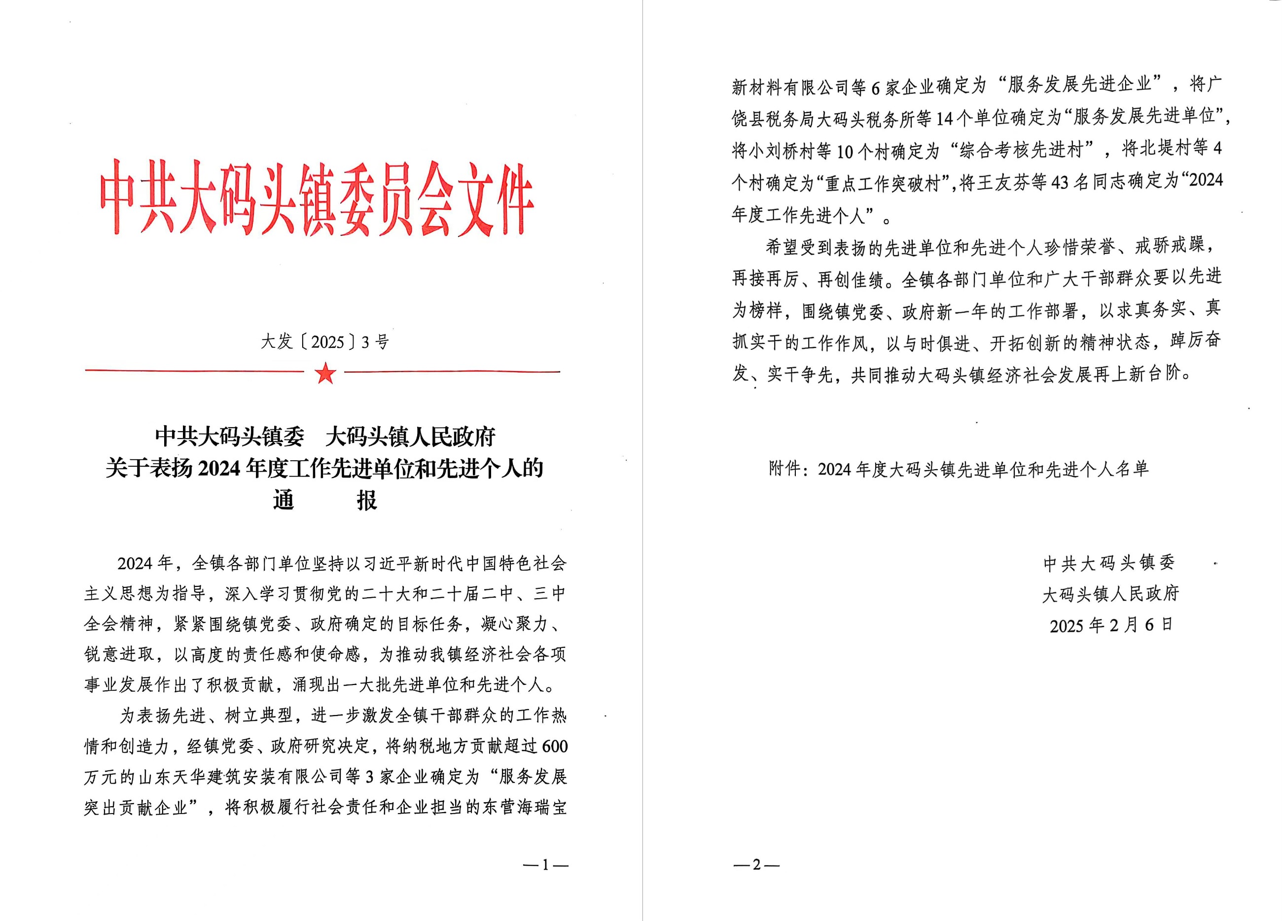 會(huì)上發(fā)布了《關(guān)于表揚(yáng)2024年工作先進(jìn)單位和先進(jìn)個(gè)人的通報(bào)》,天華實(shí)業(yè)集團(tuán)光榮上榜,被授予“2024年度突出貢獻(xiàn)企業(yè)”榮譽(yù)稱號(hào)。