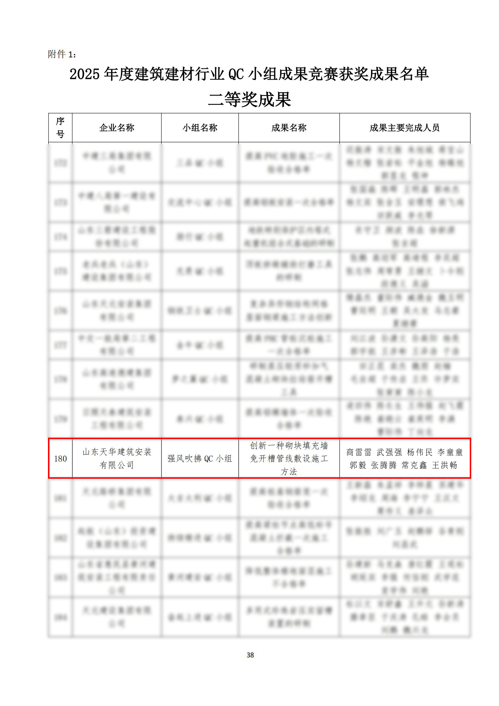 近日,由山東省建筑業(yè)協(xié)會和山東省建設(shè)工會聯(lián)合組織開展的2025年度山東省建筑業(yè)QC小組成果競賽活動圓滿收關(guān)。經(jīng)企業(yè)自愿申報、地市推薦、初賽和現(xiàn)場發(fā)布,天華實業(yè)集團強風(fēng)吹拂QC小組申報的《創(chuàng)新一種砌塊填充墻免開槽管線敷設(shè)施工方法》QC小組成果從眾多成果中脫穎而出,榮獲2025年度山東省建筑業(yè)QC小組競賽成果二等獎。