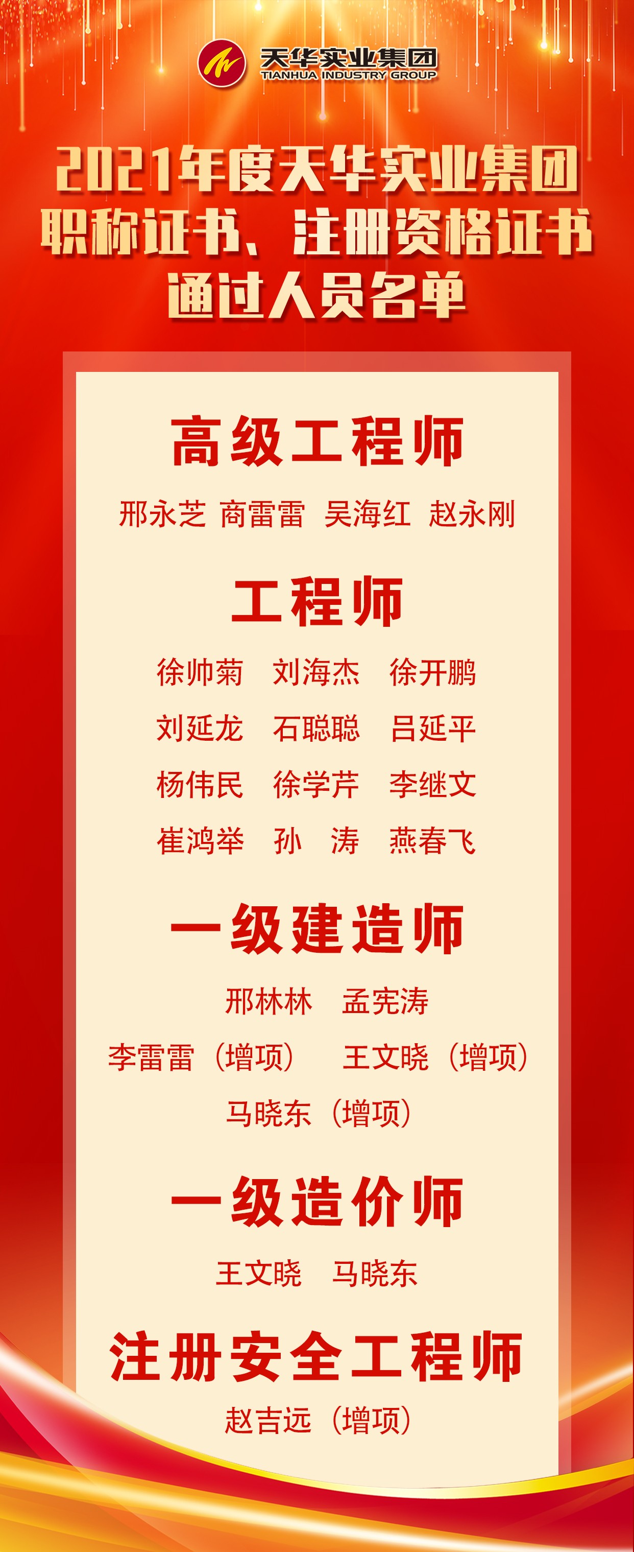 近日,2021年度全國一級建造師資格考試與職稱取證均已發(fā)布成績。天華實業(yè)集團(tuán)新增4名高級工程師、12名工程師,5名員工順利通過一建資格考試,2名員工通過一級造價師,1名員工通過注冊安全工程師,現(xiàn)將通過人員進(jìn)行公布。