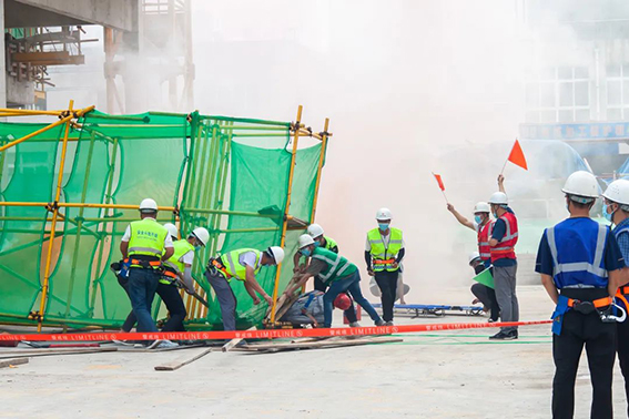 本次演練現(xiàn)場模擬了落地式操作平臺坍塌并引發(fā)火災(zāi)的綜合事故演練。事故發(fā)生后,現(xiàn)場安全員第一時間向指揮部匯報事故情況,項(xiàng)目負(fù)責(zé)人立即啟動應(yīng)急預(yù)案,組織人員對事故現(xiàn)場進(jìn)行警戒隔離、應(yīng)急搶險,公安、醫(yī)療等救護(hù)部門立即到達(dá)現(xiàn)場進(jìn)行救援,成功將受傷人員營救出事故現(xiàn)場,迅速完成了各項(xiàng)演練任務(wù)。